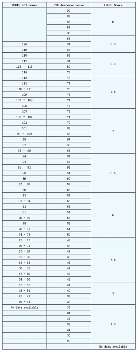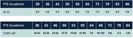 PTE与托福、雅思分数段对比