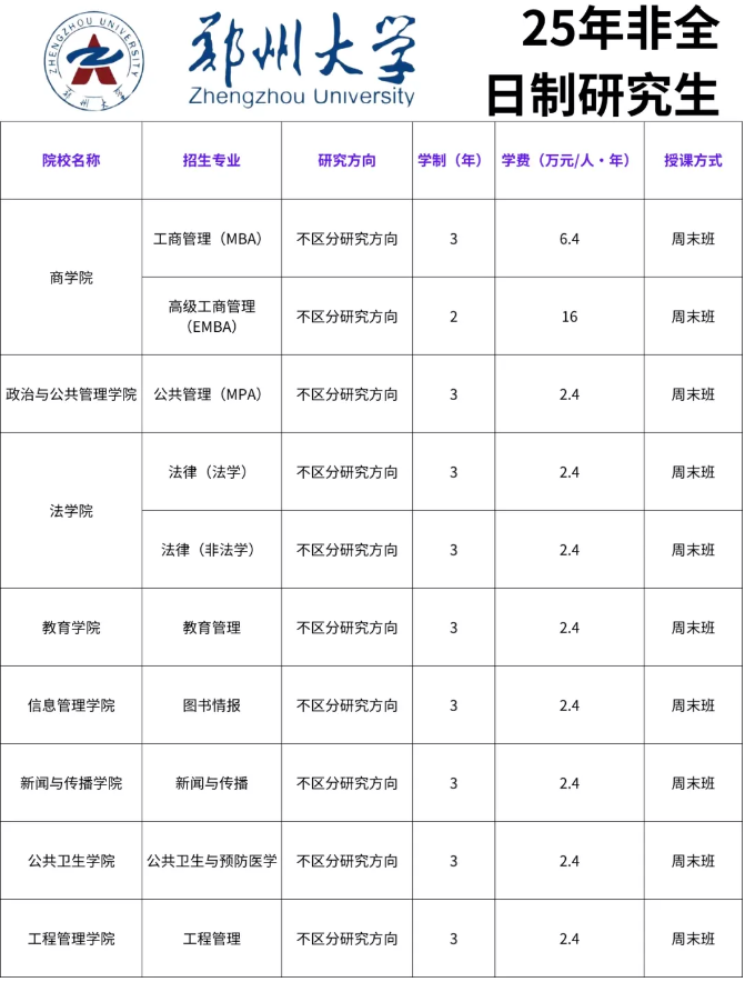 招生专业方面,郑州大学非全日制研究生涵盖工商管理、公共管理、工程管理、高级工商管理、法律(非法学)、法律(法学)等多个领域。学费根据专业不同有所差异,区间在2.4万至16万之间,各专业具体的收费标准可参考《郑州大学非全日制研究生招生简章》。