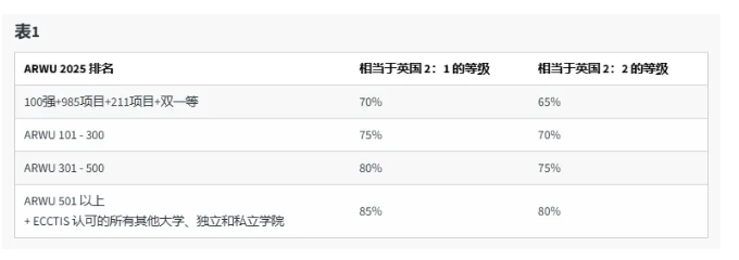 社科类专业:Tier1院校70分,Tier2院校75分,Tier3院校80分;