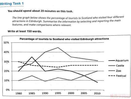 1. 首先要读出最上方的题目意义(这个线图表明了游客游览在苏格兰爱丁堡的四个景点的占比情况),并按照自己的理解和需要标出核心词。