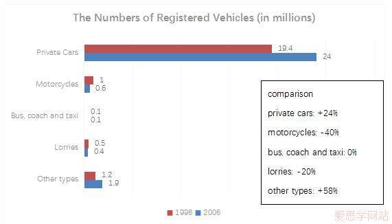 Shown in the bar chart and the table are the number of five categories of registered vehicles in 1996 and 2006, and the percentage change of each category over the same time.