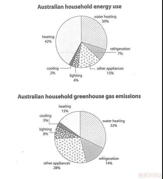 Water heating is not only a large energy consumer but also a large emitter of greenhouse gas. Roughly one-third of a household’s energy consumption is attributed to it, and so is the case with the emissions of greenhouse gas.Contrary to water heating, cooling and lighting consume small portions of energy and emit greenhouse gas that also account for small proportions. 措辞时注意:主语的多样性