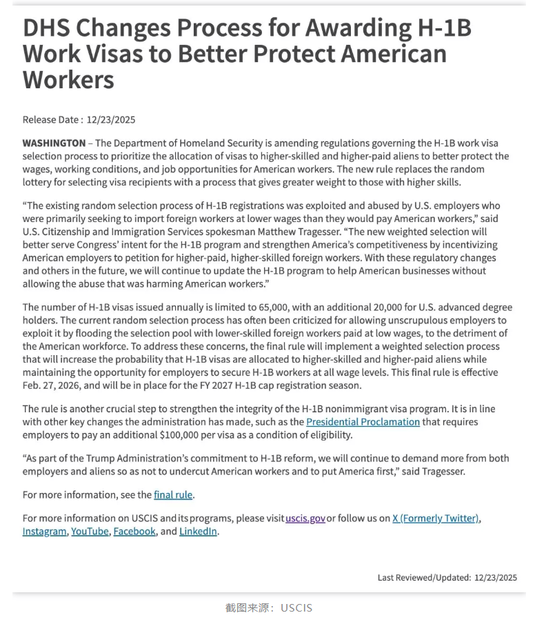 2025年12月23日,美国国土安全部正式敲定一项颠覆性政策,瞬间搅动整个留美就业市场的格局:自2026年3月起,H-1B签证抽签机制将终结延续多年的「随机盲抽」规则,全面迈入「按工资加权」的新纪元。