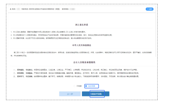 2.5 阅读网上报名承诺以及中华人民共和国刑法条例,选择“完全同意”和“已阅读并知晓”。