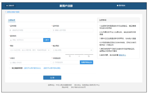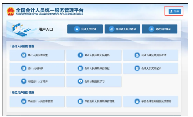 全国会计人员统一服务管理平台,点击右上角“注册”按钮,进入注册页面。