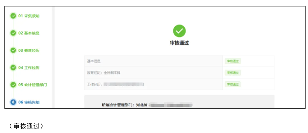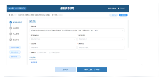 即:报考人员首先登录全国会计人员统一服务管理平台进行信息采集,填写基本信息、教育经历、工作经历等内容,信息填报完成后,提交审核,所填信息由所在地会计管理部门审核,符合条件审核通过之后再进行报名;如不符合报名条件,请根据实际情况进行信息变更,信息变更通过当地财政局会计管理部门审核后,再进行报名。