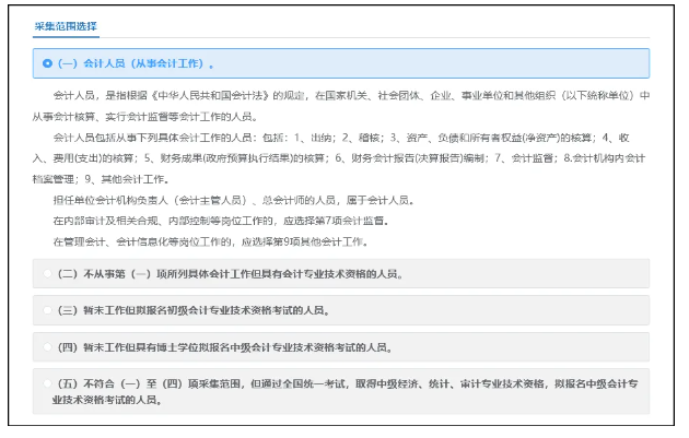 (五)不符合(一)至(四)项采集范围,但通过全国统一考试,取得中级经济、统计、审计专业技术资格,拟报名中级会计专业技术资格考试的人员。