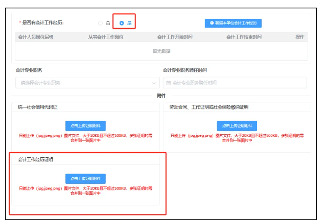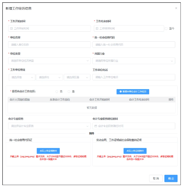 会计专业职务为非必填,如果填写了会计专业职务需要选择会计专业职务聘任时间(会计专业职务聘任时间不能早于工作开始时间)以及上传聘任证明。
