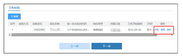 在填写完工作经历信息后页面表格会回显填写完的信息,可以进行查看详情、编辑以及删除操作。