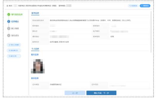 2.8 进入“信息确认”页面,确认自己填写的报考信息无误后,点击“确认无误,下一步”。