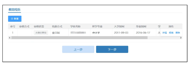 在填写完教育经历信息后页面表格会回显填写完的信息,可以进行查看详情、编辑以及删除操作。