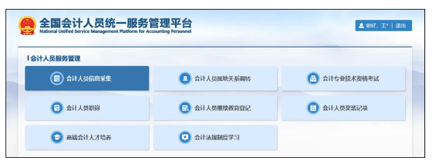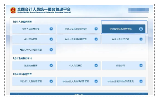 2.2 登录成功后,点击“会计人员服务管理-会计专业技术资格考试”进行会计报名。(先进行信息采集,审核通过后方可报名)