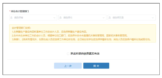 工作经历页面点击下一步,进入到会计管理部门页面。在会计管理部门页选择所在会计管理部门省、市、区县。关系到后续信息采集审核等一系列操作,请认真核对后,勾选“承诺所提供信息真实有效”后提交审核。