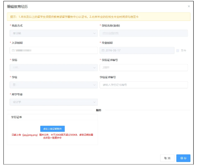 在教育经历页中,点击新增进行教育经历的信息采集。新增教育经历弹窗包括培养方式、学校名称、学历、学位(填写已取得证书的学历、学位)、所学专业、入学时间、毕业时间、学历证书编号、学位证书编号以及根据所填信息上传必要的附件(只能上传(jpg,jpeg,png)图片文件,大于20KB且不超过500KB,多张证明的需合并到一张图片中)。