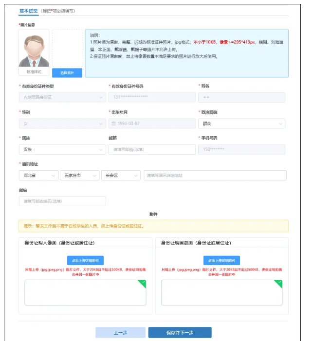 采集须知页点击下一步进入到基本信息页。在基本信息页中需要上传清晰、完整、近期的标准证件照片,并且要求不小于10KB,像素>=295*413px,请仔细阅读上传照片框右侧的说明。基本信息中有效身份证件类型、有效身份证件号码、姓名、性别、出生年月以及手机号码为注册时所填信息,基本信息页不可修改。在填写完整基本信息后点击下一步,进入到教育经历页。