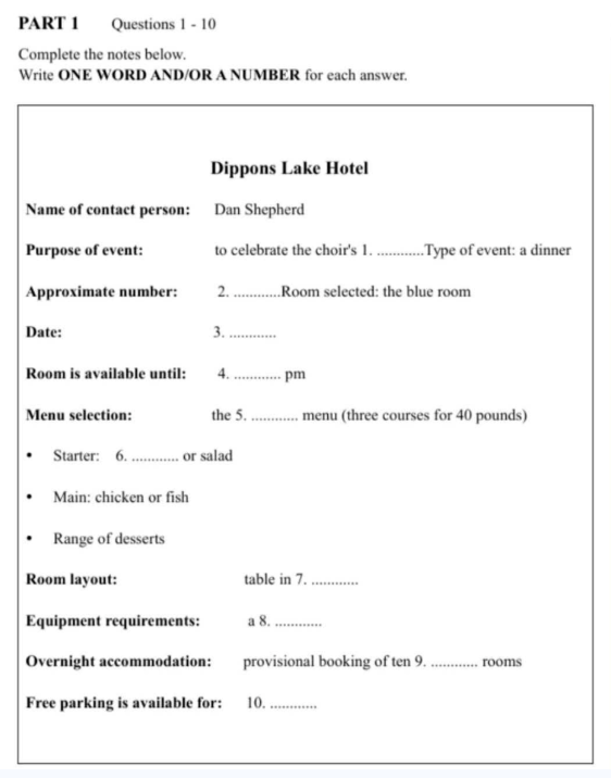 场景为电话预订酒店活动,生活类话题,但数字和拼写要求高。