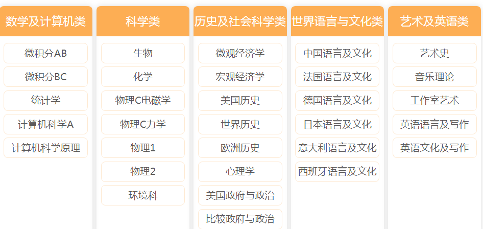 由于AP课程相当于大学课程水平,比一般的高中课程更深入、复杂和详细。 至今一共有38门AP科目可供修读,分为7大类:艺术类、英语类、历史与社会科学类、数学与计算机科学类、自然科学类、世界语言与文学类,及顶石文凭项目类。AP对学科的数目没有限制,但通常来说学生会选择4-5门学习。参加AP考试科目多、考分高的学生被美国名校另眼相看。英国、加拿大、澳大利亚等国也将此作为发放奖学金的主要条件之一。