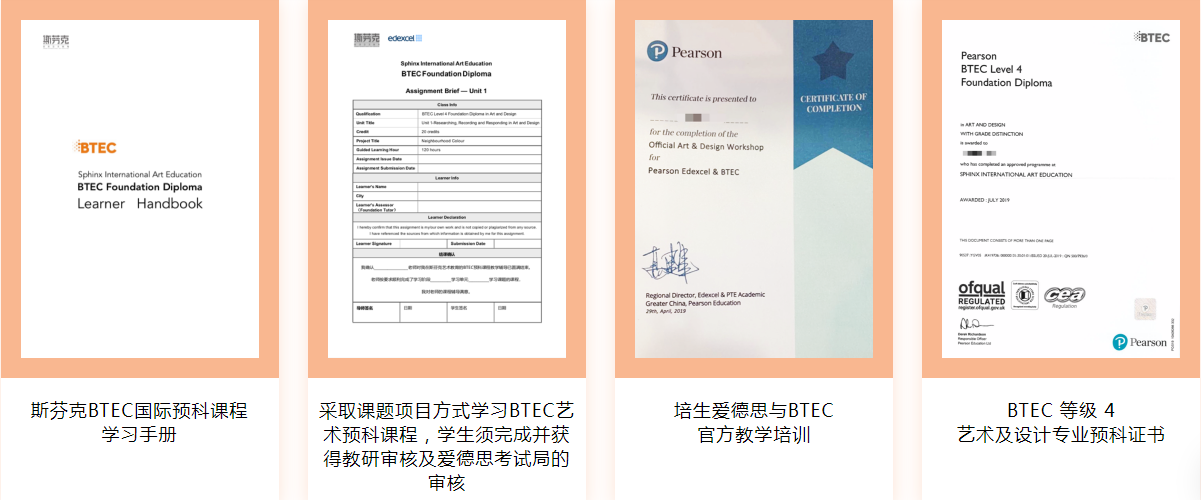 顺利完成该预科课程的学生将获培生爱德思(Pearson Edexcel)官方颁发的 BTEC Level 4 Art and design foundation diploma (BTEC 等级 4 艺术及设计专业预科证书 ) ,英国职称及教育考试总署(OFQUAL , office of qualifications and examinations regulation)认可 该证书获全球认可,级别可等同于英国大学的预科课程,学生凭借BTEC 证书,可直接申请英国本科一年级。