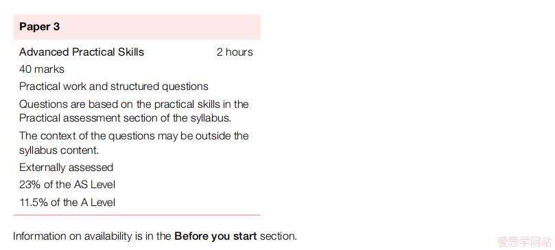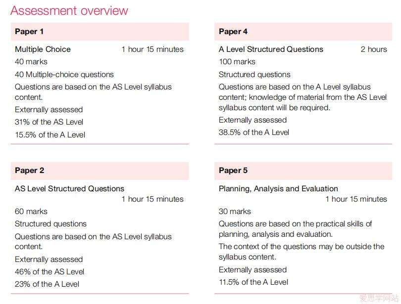 Paper5: 为实验分析题,基于一些实验的笔试,考查实验的设计,分析和评估,总分30分。考试时间75分钟。占总成绩11.5%。通过笔试考查实验设计、数据分析和评价,不需要实际操作实验。