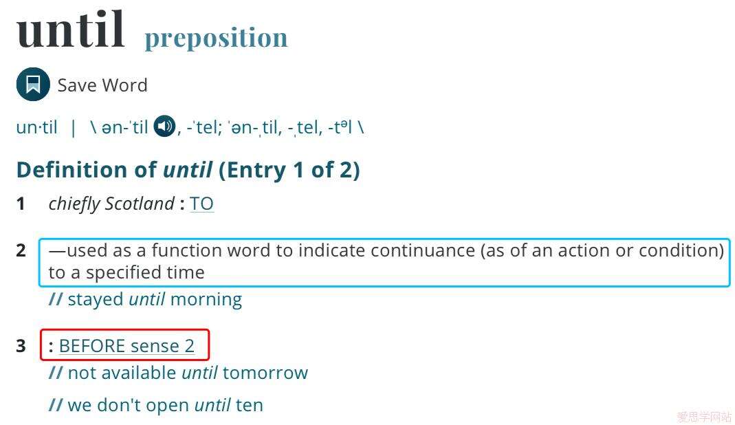 韦氏爸爸给出的释义中,红色部分表明,until = before,就是【在…之前】的意思。而仔细看蓝色部分:until是一个功能词汇,until X = 动作持续发生到X, 也就是【在X之前持续发生】的意思。