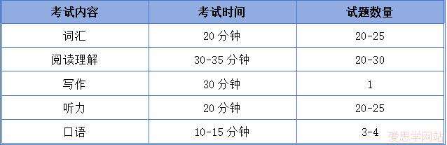 AEAS英语水平考试时间为2个小时,考试内容包括以下5个部分: