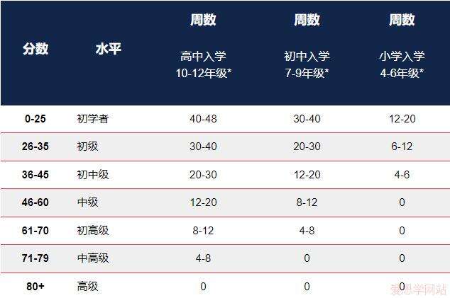 下表是AEAS英语水平考试成绩与英语预备课程周数对照表: