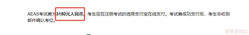 AEAS考试费为3150元人民币,考生可在注册考试时选择支付宝在线支付,支付成功后,考生会收到邮件确认考位。考生需要在考试前至少7个工作日支付全额费用。