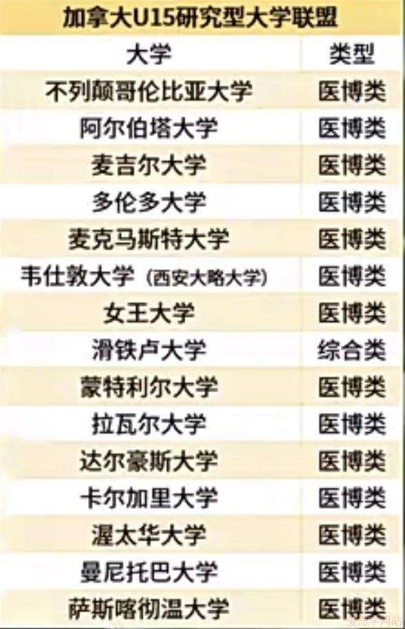 加拿大有一个u15大学联盟,包括了加拿大15所顶尖大学,其中14所都是一博类大学,只有滑铁卢大学一所综合类大学,综合类大学