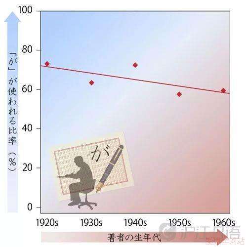 纵轴表示“が”的使用比例(%),横轴表示作者的出生年代(越向右越年轻)。从图上来看,“が”的比例正在减少。换句话说,这张图展现了人越年轻越常使用“を”而非“が”这一倾向。也就是说从变化上来看,即便语法上使用“が”是正确的,但人们使用“を”的倾向正逐渐增加。如上文所述,“が”与“を”使用方法因各种要因和条件出现差异,而且还在不断变化,要判断到底哪一方更自然实际是个难题,或许答案都无法确定。