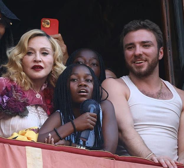 与她同框的有:8月11日刚满25岁的儿子罗科·里奇、28岁的大女儿罗德丝·里昂、12岁的双胞胎女儿斯特拉和埃斯特尔,以及她的男友阿基姆·莫里斯。