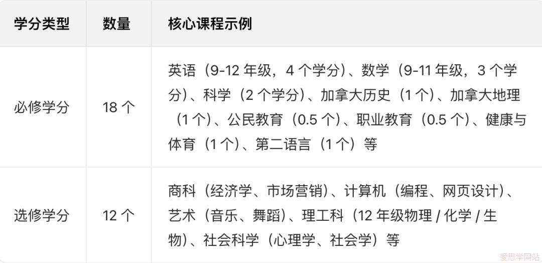 必修课:涵盖英语、数学、科学(物理/化学/生物)、加拿大历史/地理、公民教育等,奠定学术基础;