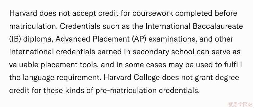 哈佛大学在官网提到:它们仅将AP、IB等考试分数作为宝贵的大学申请工具考虑,在某些情况下甚至可以用来满足语言或标化要求,但这些考试成绩不能转化为大学学分。