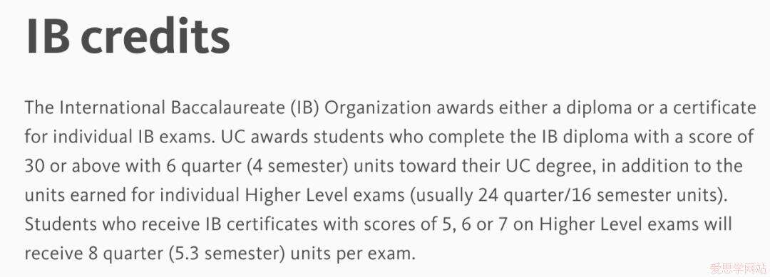 加州大学(UC)系统对成功获得IB文凭且总分达到30分或以上的学生,将额外授予6个学季制学分(4个学期制学分)。如果学生还完成了满足要求的HL课程还能单独获得至高24个学季制学分(16个学期制学分)。