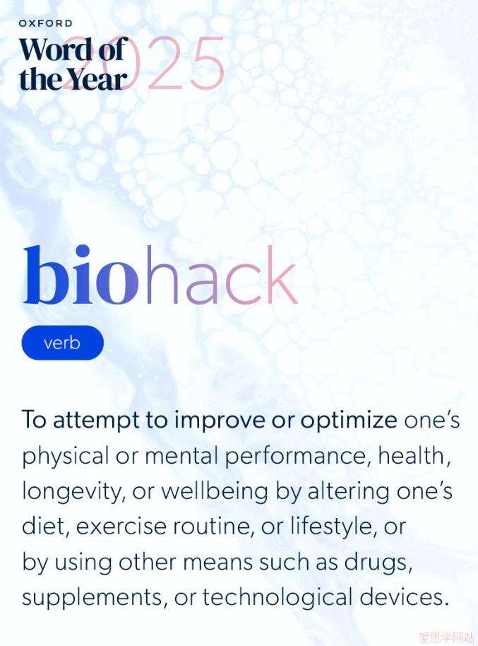 是指:to attempt to improve or optimize one's physical or mental performance, health, longevity, or wellbeing by altering one's diet, exercise routine, or lifestyle, or by using other means such as drugs, supplements, or technological devices。