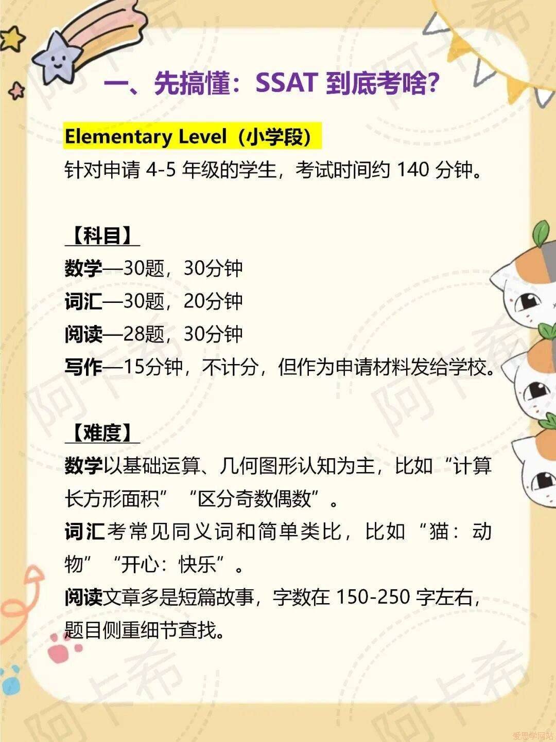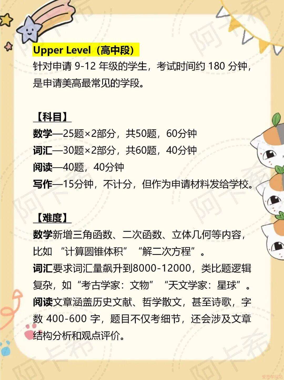 想申美高的宝子,一定绕不开 SSAT!它是美国中学入学考试,相当于美高“入场券”,全球顶尖私立中学都认它,主要分小学(4-5 年级)、初中(6-8 年级)、高中(9-12 年级)三个学段,高中段最常见。