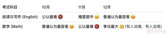 在阅读写作部分,共识相对集中一些。“10月英语公认最难”的说法流传甚广,而12月则被普遍认为是阅读写作部分相对“友好”的月份。11月则处于两者之间。