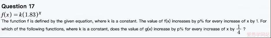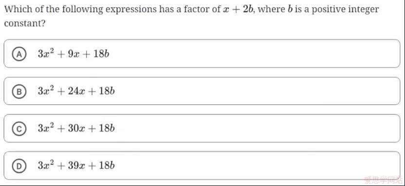 Algebra部分判断函数图像求解表达式仍然是考察的重点,此外本次考试又重复考到了linear regression的题目,以及因式分解此类经典的考点,指数函数也是几乎每场考试都会涉及到的重点知识点。这些考点都是高频考点,只要掌握了典型考法和基本知识点,做题就不会有障碍啦。以下例题是关于linear regression、因式分解和指数函数的典型考法: