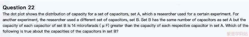 Problem solving and data analysis部分仍然有以点图形式考察的平均数、标准差和中位数的大小比较题型,考点和考试形式都比较固定。此类题目一定要注意看清楚增加的数值是在所有数据整体上都增加还是在所有数值里加入一个新数值。以下是典型例题:
