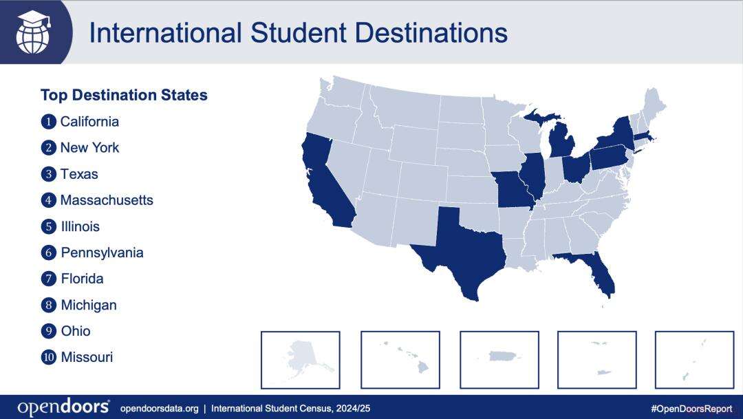 再分享一个对每一位申请美国大学的学生有价值的数据,在选择留学目的地的排名中(上图),加州、纽约州和德州和24年一样没有变化,加州和纽约州的在院校和就业的优势不必多说,第3位的德州已经稳稳占据在前3的位置了,值得我们在选校和就业上作为一个重要考量的留学目的地。
