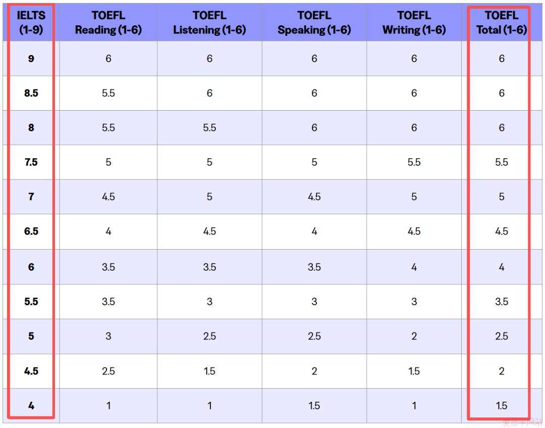 新托福与雅思分数对照表