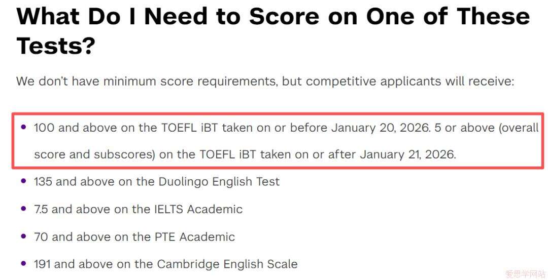 2026年1月后考试:新托福最低5.0分,且各单项不低于4.0分。