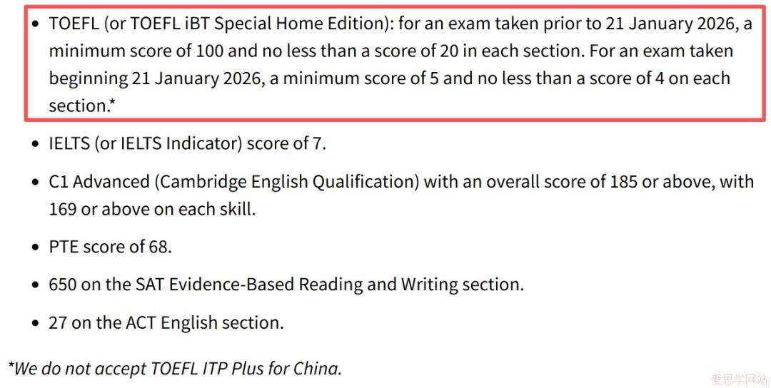 2026年1月前考试:旧托福最低100分,且单项不低于20分;