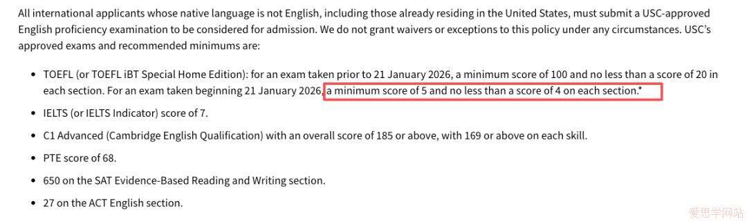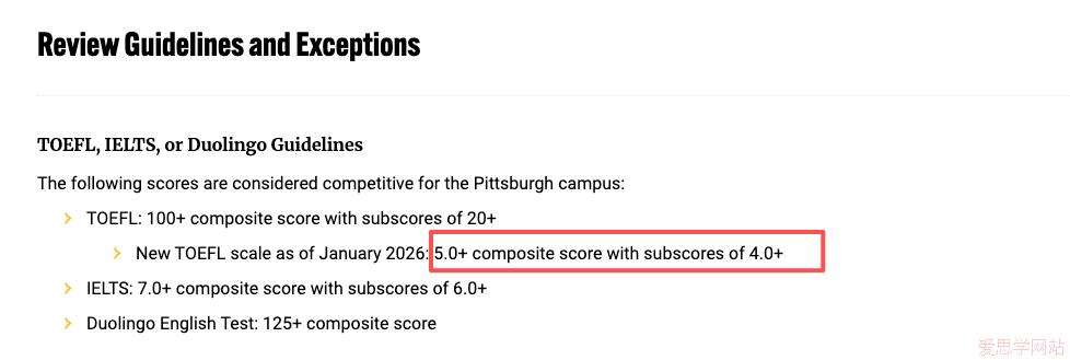 2026年1月后新托福要求5.0分(对应旧制95+),传媒、工程学院建议5.5分(107+)。无“分阶段提升分数”的官方政策,2026年1月前旧托福需≥90分。