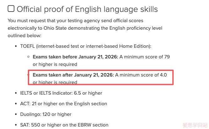 2026年1月前参加的托福考试,要求总分在100分及以上。2026年1月或之后参加的托福考试,要求总分及单项均需达到5.0或以上。