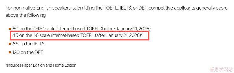 2026年1月前参加的托福考试,要求总分100+;单项不低于20。2026年1月或之后参加的托福考试,要求总分5.0+,单项不低于4.0。