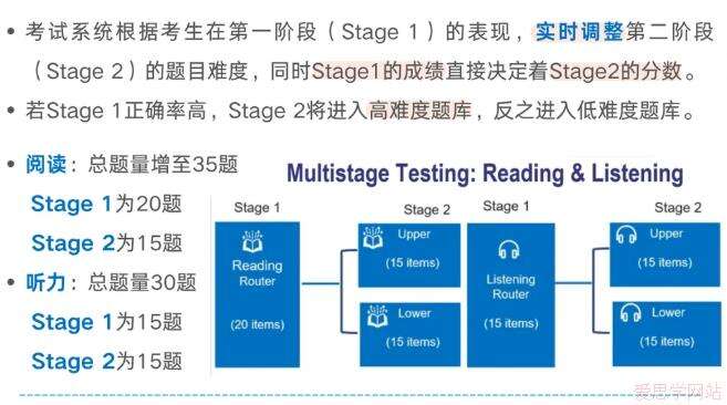 从2026年1月21日起,托福iBT将在阅读与听力部分启用多阶段自适应(MST)机制。简单来说:第一阶段题目固定,第二阶段则根据你的表现动态调整难度。发挥越好,后续题目越具挑战性;反之则趋于基础。